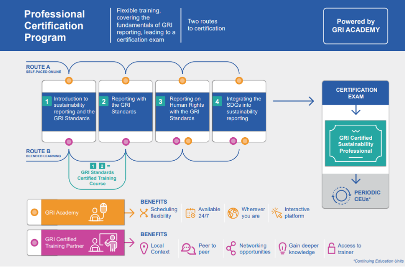 La réussite de ce cours permet d'obtenir la certification officielle délivrée directement par GRI (aucun examen n'est nécessaire à la fin du programme).